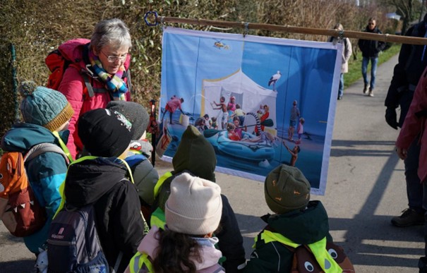 Eine Gruppe Kita-Kinder nahm das Hungertuch genau in den Blick und diskutierte mit den Pilgernden über die Abbildungen.