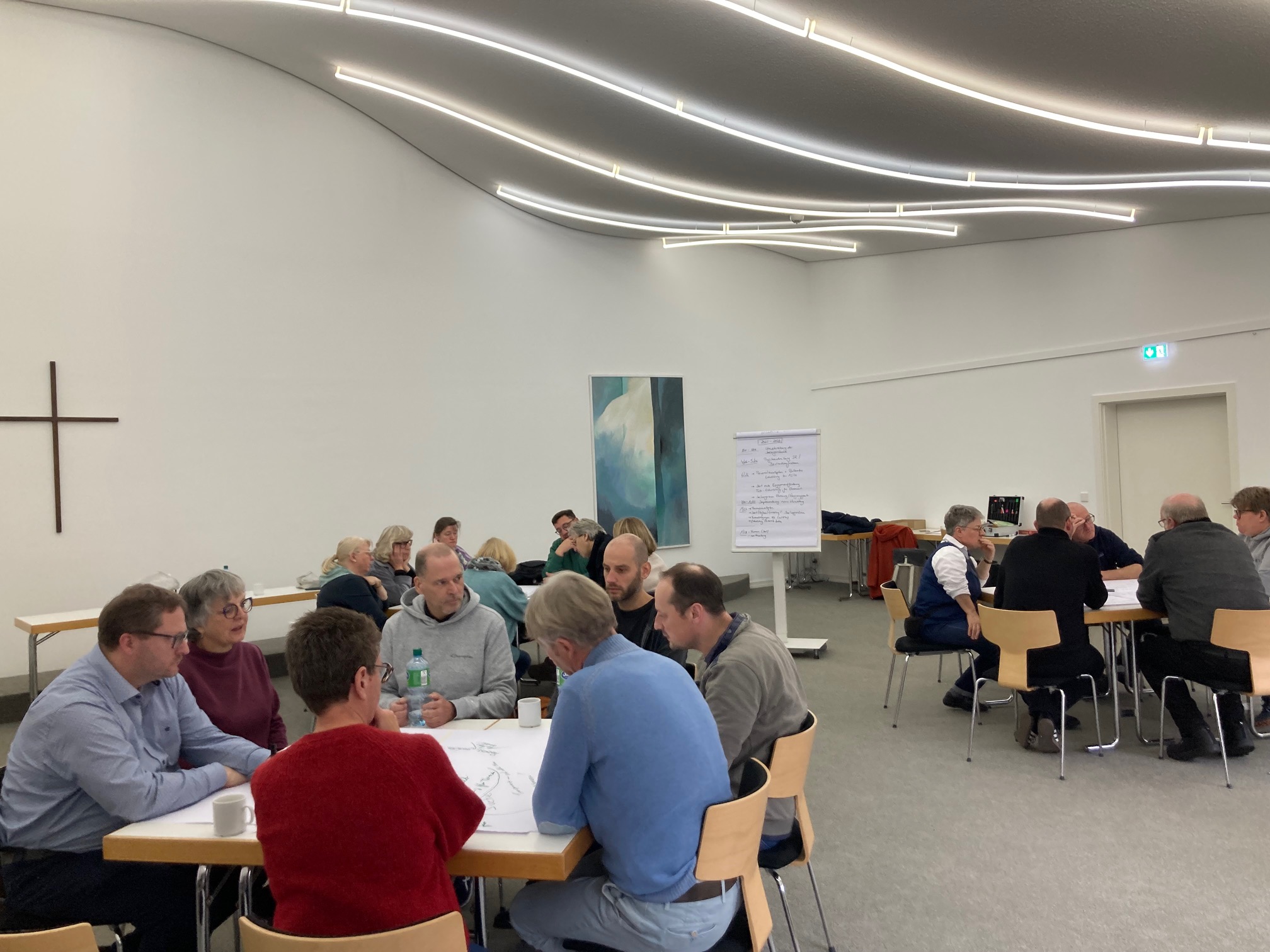 Trotz des anhaltenden Regens waren es zuversichtliche Tage im Kloster Gerleve im Bistum Münster, an der 26 Hauptamtliche des Dekanats Hellweg (Priester und Laienmitarbeitenden aus Gemeinden und Einsatzfeldern wie Schulseelsorge, Krankenhaus und Caritas) teilnahmen. Nach einem allgemeinen Austausch am ersten Tag zu den momentan anstehenden Fragen des Alltags nahmen sich die Teilnehmenden einen ganzen Tag Zeit für die Besinnung. Unter guter Anleitung von Pater Elmar Salmann OSB wurde dabei bedacht, wie die Transformationsprozesse der Kirche und des Erzbistums auf die eigene Person und Rolle auswirken und welche Fragen und Ankerpunkte sich aus dem Glauben ergeben. Auch wegen der klösterlichen Gebetsangebote schwangen diese Gedanken in der gesamten Tagung mit. Am Mittwoch wurde dann konkret an den Themen des Bistumsprozesses gearbeitet. Auch hier kamen kommende Rollenveränderungen zur Sprache, Herausforderungen, Sorgen und Hoffnungen wurden besprochen. Welche Haltungsänderungen hinsichtlich Kommunikation und Synodalität werden nötig sein? Wie wird sich das Verhältnis von Haupt- und Ehrenamt verändern? Wie kann Seelsorge im weiten Raum gelingen, so dass Nähe zu Menschen ermöglicht wird? Sehr zuversichtlich zeigte sich nicht nur abschließend: Dem Wir-Gefühl eines kommenden Seelsorgeraumes sind wir ein gutes Stück nähergekommen. Die kommenden weiteren Schritte Hand in Hand mit Erzbistumsmitarbeitenden und den ehrenamtlich Verantwortung Tragenden nehmen wir beherzt in Angriff!